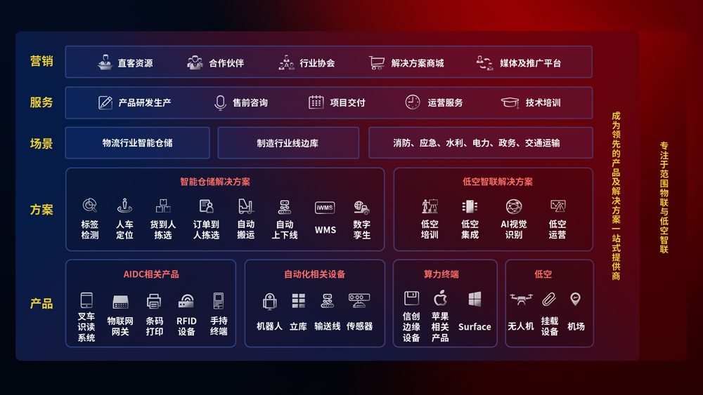 聚合国内外先进的物联网硬件产品品牌,聚焦数字化仓储、机器人运营、低空智联网等领域,共同打造适合客户业务场景的解决方案并提供交付服务